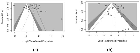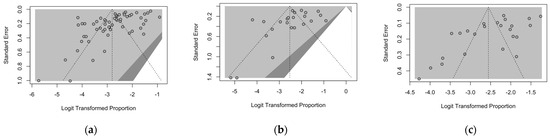 Publication bias was assessed through the calculation of contour-enhanced funnel plots. As publication bias is suggested by asymmetry of funnel plots; after the visual appraisal, Egger’s test was performed as a confirmatory test for all outcomes with three or more included studies [64,76]. Small-study bias was similarly assessed by generating corresponding radial plots, with their visual appraisal for the uneven clustering of individual estimates across the regression line. A p-value < 0.05 was considered statistically significant for both publication and small-study bias.