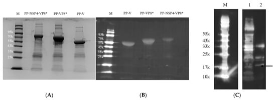 The fusion proteins of PP-VP8*, PP-NSP4-VP8*, PP-V, and NSP4 were expressed and purified using the E. coli expression system. SDS-PAGE (Figure 1A) and WB (Figure 1B) revealed that the sizes of the PP-VP8*, PP-NSP4-VP8*, and PP-V proteins were 65 kDa, 70 kDa, and 55 kDa, respectively. Their sizes were all as expected. The size of NSP4 was between 15 kDa and 20 kDa (Figure 1C). According to other research, we speculated that NSP4 may form multimers [43,44]. However, the concentration of NSP4 was very low, at nearly 1 μg/mL.
