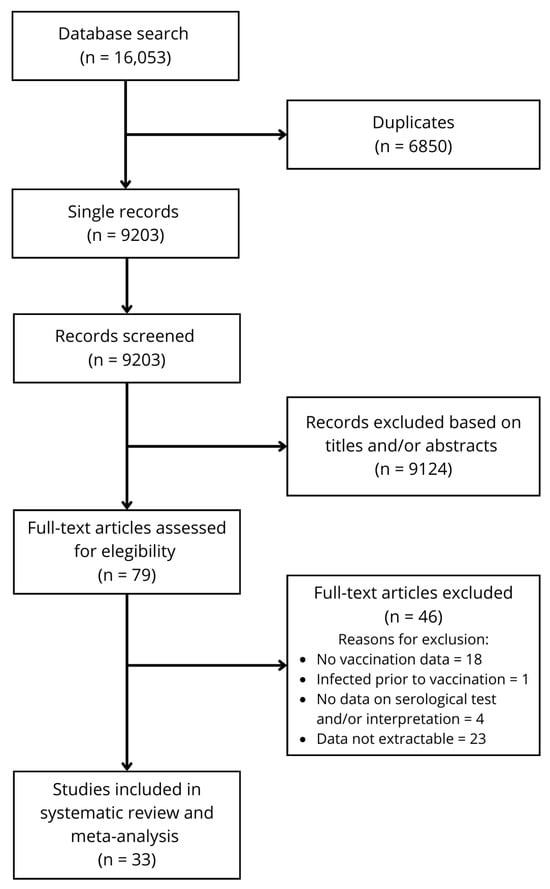 The search identified 16,053 articles, of which 6850 were duplicates, resulting in 9203 unique records. After reviewing the titles and abstracts for compliance with the inclusion and exclusion criteria, 79 full-text articles were assessed for eligibility (Figure 1). Of these, 33 were included in the systematic review and meta-analysis, while 44 were excluded after checking the inclusion/exclusion criteria. One of the articles was included both in the effectiveness and sero-immunity evaluation.