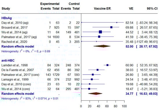 To estimate a random-effects model for the sero-immunity, defined as the proportion of participants with anti-HBs ≥ 10 mIU/mL and with a 95% confidence interval (95% CI), an inverse variance method was used [22]. The effectiveness of the vaccine against HBV infection (1-prevalence ratio) and the 95% CI were calculated using the Mantel–Haenszel method, since it may be preferable to the inverse variance method when data are sparse [23,24].