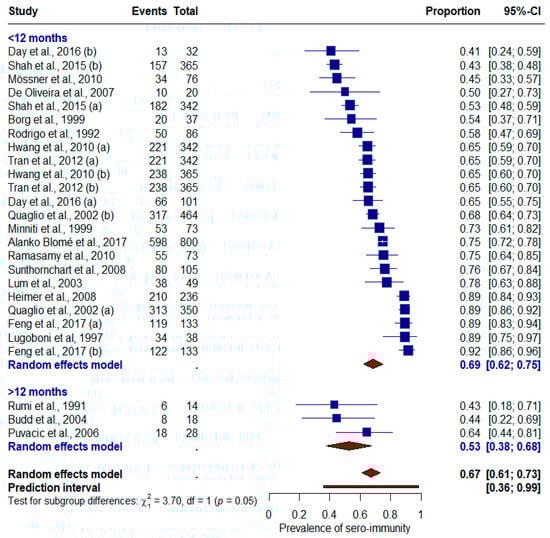Subgroup analysis comparing the time (months) since vaccination (Figure 3) showed a sero-immunity of 68.7% (95% CI: 62.3–75; I2 = 96.1%) during the first 12 months, and 52.6% (95% CI: 37.6–67.7; I2 = 24.9%) after 12 months [36,37,38,41,42,43,46,47,48,50,51,52,53,54,55,56,57,58,59,60]. Similarly, the subgroup analysis according to vaccination schedule (Supplementary Figure S11) demonstrated a slightly higher sero-immunity (0.69; 95% CI: 0.62–0.75; I2 = 95.4%) with a standard schedule than with an accelerated schedule (0.62; 95% CI: 0.40–0.73; I2 = 19.1%) [36,37,38,40,41,42,43,45,47,48,50,51,52,54,55,56,57,58,60]. The difference in both subgroup analyses was not statistically significant.