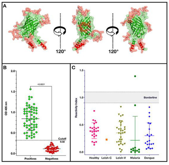 - Daltro, R.T.; Leony, L.M.; Freitas, N.E.M.; Silva, Â.A.O.; Santos, E.F.; Del-Rei, R.P.; Brito, M.E.F.; Brandão-Filho, S.P.; Gomes, Y.M.; Silva, M.S.; et al. Cross-Reactivity Using Chimeric Trypanosoma cruzi Antigens: Diagnostic Performance in Settings Where Chagas Disease and American Cutaneous or Visceral Leishmaniasis are coendemic. J. Clin. Microbiol. 2019, 57, e00762-19. [Google Scholar] [CrossRef]