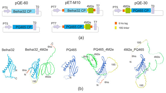 (a) Schematic representation of the expression vectors. PT5, bacteriophage T5 promoter for E. coli RNA polymerase, with embedded lac operator; T0, lambda T0 terminator; PT7, bacteriophage T7 promoter; T7, bacteriophage T7 terminator; 4M2e, four tandem copies of the M2e peptide; PQ465, coat protein of bacteriophage PQ465; Beihai32, coat protein of bacteriophage Beihai32. The 6his tag and 19S linker are shown by orange and yellow boxes, respectively. (b) The structures of single monomeric proteins were predicted using Alphafold v.2.3.1 [28] and visualized using the SWISS MODEL server [29].