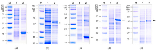 Expression of recombinant proteins in E. coli. The proteins isolated from E. coli were analyzed by SDS-PAGE. M, molecular weight marker (kD); proteins isolated from E. coli cells before (lane 1) and after (lane 2) induction of expression. Proteins: Beihai32 (a), Beihai32_4M2e (b), PQ465 (c), 4M2e_PQ465 (d), PQ465_4M2e (e). Positions of the target proteins are indicated by arrows.