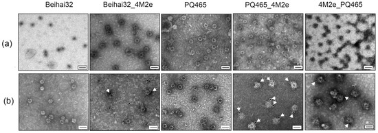 Immunogold transmission electron microscopy analysis confirmed that PQ465_4M2e particles carried the 4M2e peptide on the surface (Figure 4). At the same time, in the cases of Beihai32_4M2e and 4M2e_PQ465 VLPs, we found gold-labeled particles on the grid, but the number of labeled particles was lower than that of PQ465_4M2e.
