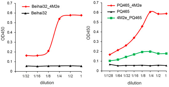 Antigenicity of VLPs. Two-fold dilutions of VLPs formed by Beihai32, Beihai32_4M2e, PQ465, PQ465_4M2e, and 4M2e_PQ465 proteins were coated on ELISA plates and then probed with antibodies specific for M2e.