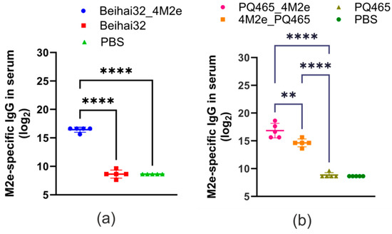 Antibody response in serum. BALB/c mice (5 per group) were subcutaneously immunized with VLPs three times at a two-week interval. Mice in the control group were injected with PBS. Two weeks after the third immunization, M2e-specific IgG titers were evaluated by ELISA. Data are presented as the anti-M2e IgG titers for individual mice with geometric mean titers ± SEM (Standard Error of the Mean) determined in each group. Statistically significant differences between groups are indicated (**, p < 0.01; ****, p < 0.0001). (a) Immunization with Beihai32_4M2e and Beihai32; (b) immunization with PQ465_4M2e, 4M2e_PQ465, and PQ465.