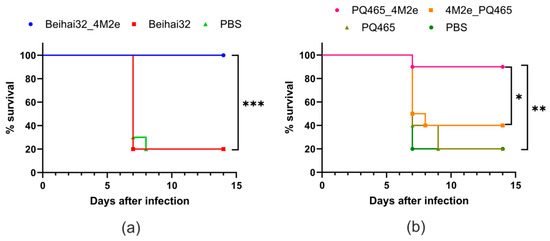 Protective efficiency of the recombinant proteins. BALB/c mice (10 per group) were subcutaneously immunized with VLPs three times at a two-week interval. Mice in the control group were injected with PBS. Two weeks after the third immunization, mice were challenged with 5LD50 of influenza strain A/Aichi/2/68 (H3N2). Survival of challenged mice was monitored for 14 days post-challenge. Statistically significant differences between groups are indicated (*, 0.01 < p < 0.05; **, 0.001 < p < 0.01; ***, p < 0.001). (a) Immunization with Beihai32_4M2e; (b) immunization with PQ465_4M2e and 4M2e_PQ465.