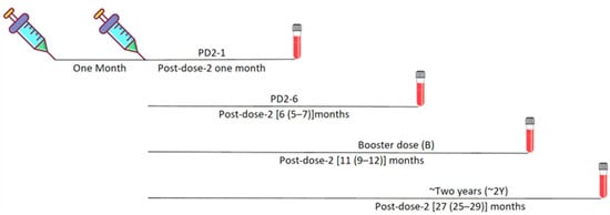Serum/plasma samples of healthcare personnel, who completed a full two-dose COVISHIELD vaccine regimen and provided written informed consent, were collected at different time points until two years post-vaccination (Figure 1).