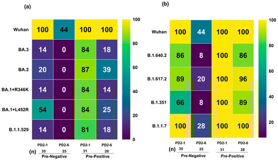 We first calculated percent seropositivity at both time points for Omicron (Figure 2a) and non-Omicron (Figure 2b) variants to study the breadth of variant-specific antibody responses. At one-month post-vaccination (PD2-1) when the peak antibody titers were observed [,] the lowest responder rate in the pre-negative vaccinees (n = 35) was noted against BA.3, BA.2, BA.1+R346K, and B.1.1.529 variants (14–20%). In contrast, 54% of the vaccinees were seropositive for the BA.1+L452R variant, suggesting that differential mutations are responsible for the varied responder rates within the Omicron subvariants. Among the non-Omicron variants, B.1.351 with 66% seropositivity was the lowest (p < 0.0001). Among the pre-positive vaccinees (n = 31), seropositivity was superior (81–87%) against the Omicron subvariants. Of these, significantly lower (81%, p = 0.032) seropositivity was seen against the Omicron variant B.1.1.529 compared to the ancestral Wuhan virus. Of most concern, in the pre-negative vaccinee group, no seropositivity was seen against the Omicron subvariants at 6 months post-vaccination (PD2-6), and a distinct reduction in anti-Wuhan, -Alpha, and -Delta seropositivity (20–44%) was evident; 8% exhibited antibodies against B.1.351 and B.1.640.2 variants. (p = 0.01–<0.0001). Clearly, six months post-second dose, the pre-negative vaccinees were negative for antibodies against all the Omicron variants and the majority against the other variants and the Wuhan virus (44% positivity). In the pre-positive vaccinees as well (n = 28), the lowest responder rate (14–39%, p = 0.01–<0.0001) was observed for the Omicron variants. However, the degree of reduction was lesser among the pre-positives (p = 0.0083–<0.0001). Thus, even most of the naturally infected and immunized individuals did not possess antibodies against the Omicron subvariants.
