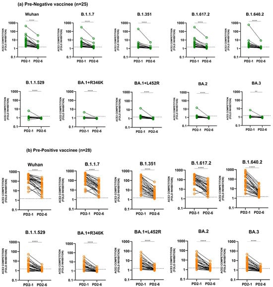 Serum/plasma samples from COVISHIELD vaccinees either (a) negative (pre-negative, n = 25) or (b) positive (pre-positive, n = 28) for IgG-anti-SARS-CoV-2 antibodies before immunization were tested for anti-variant antibodies in the MSD-25 assay at 1 (PD2-1) and 6 months (PD2-6) post-2nd dose. Wilcoxon matched-pairs signed rank test was used for comparing ACE2 competition (fold inhibition) values at PD2-1 and PD2-6. ** p = 0.001 and **** p ≤ 0.0001. The dotted line denotes the assay cut-off value (1.5-fold).