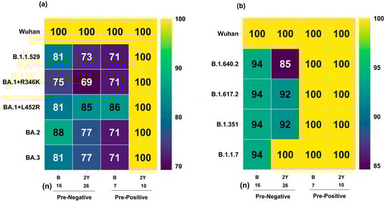 Serum/plasma samples from COVISHIELD vaccinees either negative (pre-negative) or positive (pre-positive) for IgG-anti-SARS-CoV-2 antibodies were tested for anti-variant antibodies in the MSD-25 assay at post-booster dose (B) and 2 years (2Y) post-2nd dose. (a) Percent seropositivity of Omicron variants and (b) non-Omicron variants are shown here. The number of serum/plasma samples in each category is mentioned below each column in the table.