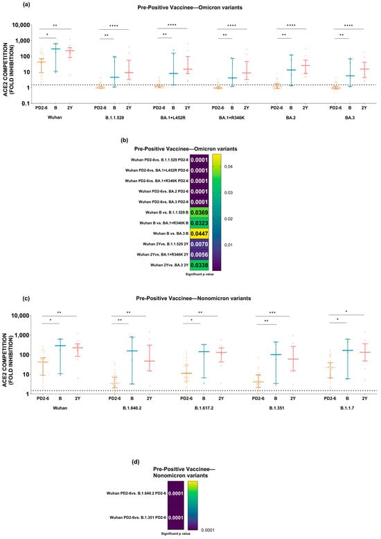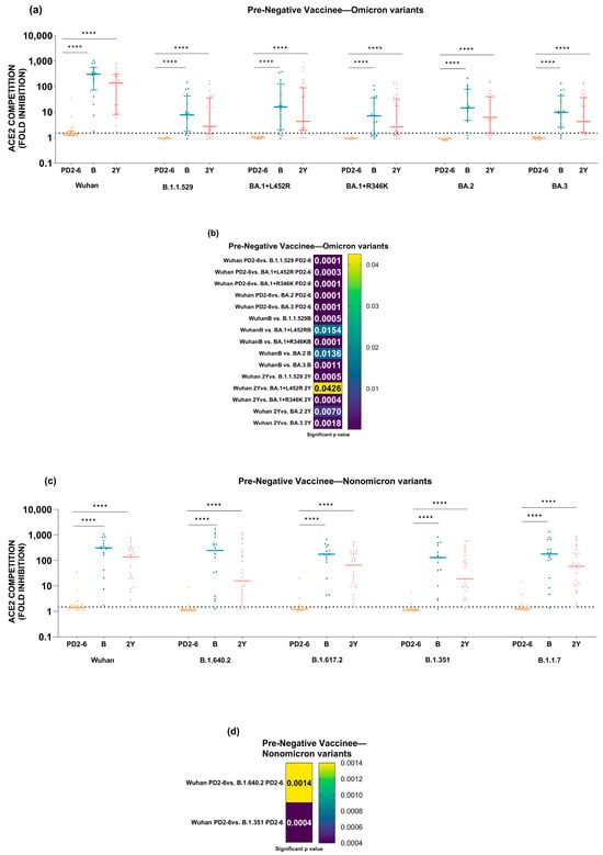 To assess this, the neutralization capacity of COVISHIELD vaccine-induced antibodies as evidenced by ACE2 competition at PD2-6 was compared with two subsequent time points among pre-negatives (Figure 5) and pre-positives (Figure 6). The analysis confirmed that the administration of a booster dose to the pre-negatives led to a significant rise in neutralizing antibody levels against all the variants that was drastically reduced at PD2-6. Furthermore, the retention of the booster effect continued for at least two years post-vaccination, re-emphasizing the inadequacy of the current schedule and the necessity of a booster dose (Figure 5a,c). Comparisons of the kinetics of anti-variant antibodies revealed that ACE2 competition of Omicron variants was significantly reduced compared to the Wuhan strain at all the time points examined (p values = 0.04–0.0001) (Figure 5b). For non-Omicron variants, when compared to the Wuhan strain, a significant reduction at PD2-6 was seen only for the B.1.640 and B.1.351 variants (p values = 0.001–0.0004) (Figure 5d).