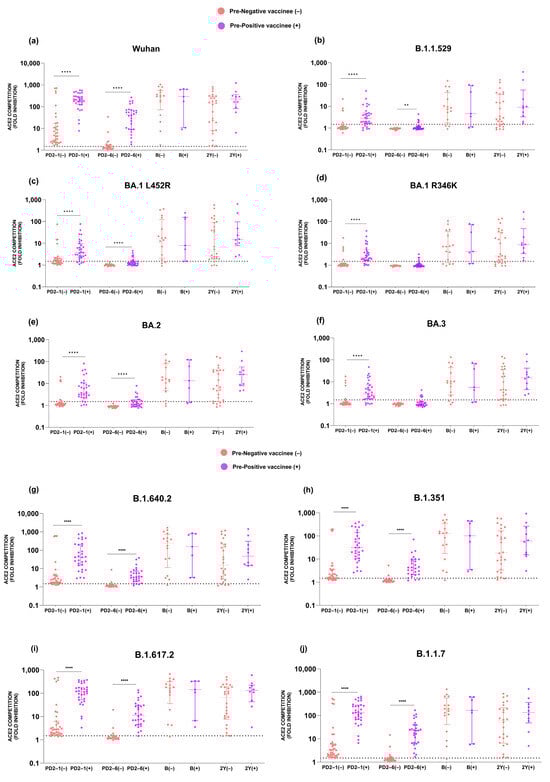 ACE2 competition (fold inhibition) values were compared among pre-negative (−) and pre-positive (+) vaccinees at all the time points. (a–j) Variant-specific comparisons at individual time points among pre-negatives and pre-positives were performed using the Mann–Whitney U test. **** p < 0.0001, ** p < 0.01. The value above each bar represents the median ACE2 competition value; variations measure the interquartile range (25–75%).