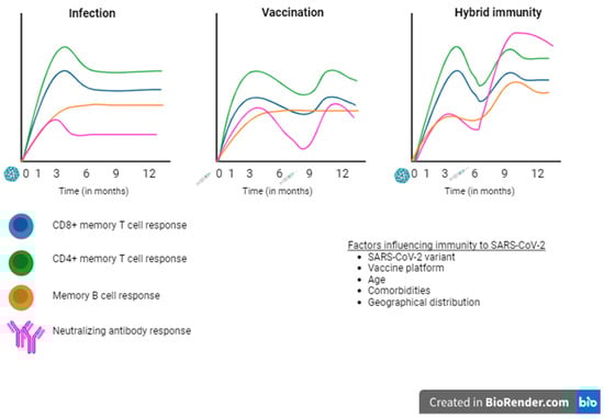 Kinetics of the various aspects of immune response to SARS-CoV-2 acquired by natural infection, vaccination, and hybrid immunity. Adapted from [80].