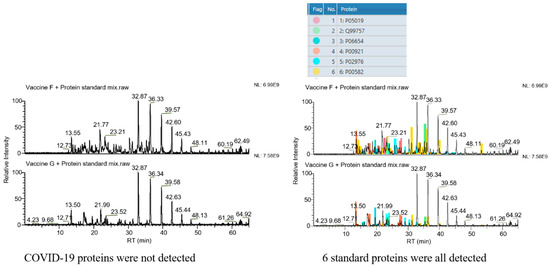 The selectivity of the assay was verified by analysis of the vaccine samples F and G (non-COVID-19 vaccines). As shown in Figure 1, the target proteins could not be detected in these two vaccine samples when COVID-19 structural proteins were defined as the target proteins. However, all six protein standard substances were observed in the result if standard proteins were set as the targets. These results demonstrated the good selectivity of the assay and its potential in diverse protein analysis.