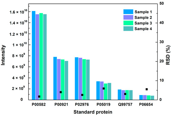 The repeatability of the method was checked by measuring the relative standard deviation (RSD) of six standard proteins in different vaccine samples. The RSD values of the six standard proteins were 1.7%, 4.1%, 2.6%, 5.9%, 3.1% and 5.5%, respectively, which shows no significant difference in four samples (Figure 2). The repeatability of the method met the requirements for analysis.