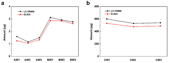 The amount of detected S protein in each (a) inactivated vaccine sample and (b) recombinant protein vaccine sample by LC-HRMS and ELISA.