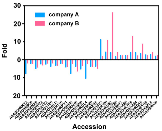 The changes of each down- or up-regulated host cell protein in two companies’ vaccine samples.