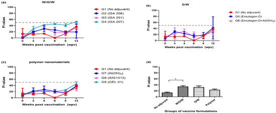 Comparison of SP antibodies (PI values) across nine groups using different adjuvant categories (Exp 1). (a) Comparison among the four groups, including the W/O/W formulation groups (G2, ISA 206; G3, ISA 201; G4, ISA 207) and G1 (no adjuvant). (b) Comparison among the three groups, including the O/W formulation groups (G5, Emulsigen-D; G6, Emulsigen-D with Al(OH)3) and G1 (no adjuvant). (c) Comparison among the three groups, including the polymer nanomaterials groups (G7, Al(OH)3; G8, IMS1313; G9, GEL 01) and G1 (no adjuvant). (d) Comparison of PI values at 8 wpv among three categories, including no adjuvant group. PI values ≥ 50% (dotted line) were considered positive for FMDV type A SP antibodies. SP; structure protein, PI; percentage inhibition, W/O/W, water-in-oil-in-water emulsion vaccines; O/W, oil-in-water emulsion vaccines; wpv, weeks post-vaccination; the datasheets are the mean ± SEM; statistical analyses were performed using one-way ANOVA; * p < 0.05.
