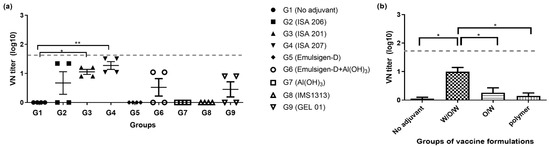 Neutralizing antibody titers of SPF mini pigs at 8 weeks post-vaccination (Exp 1). (a) VN titers against the A/Iraq/24/64 strain by each group: G1, (no adjuvant), G2 (ISA 206), G3 (ISA 201), G4 (ISA 207), G5 (Emulsigen-D), G6 (Emulsigen-D with Al(OH)3), G7 (Al(OH)3), G8 (IMS1313), G9 (Gel). (b) VN titers against A/Iraq/24/64 strain in each category. W/O/W adjuvant (G2, ISA 206; G3, ISA 201; G4, ISA 207), O/W adjuvant (G5, Emulsigen-D; G6, Emulsigen-D with Al(OH)3), polymer nanomaterials (G7, Al(OH)3; G8, IMS1313; G9, GEL 01). (b) VN titers against the A/Iraq/24/64 strain categorized by adjuvant types. VN titers ≥ 1.65 log10 (dotted line) are considered positive for FMDV antibodies. G, group; ID, intradermal; SPF, specific pathogen-free; W/O/W/, water-in-oil-in-water emulsion vaccines; O/W, oil-in-water emulsion vaccines; wpv, weeks post-vaccination; the datasheets are the mean ± SEM; statistical analyses were performed using one-way ANOVA; * p < 0.05; ** p < 0.01.