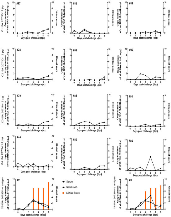 Following the homologous challenge at 4 wpv in Exp 2, the four vaccinated groups (C1; ISA 207/ID/12 μg, C2; ISA 207/ID/1.2 μg, C3; ISA 207/IM/12 μg, C4; ISA 207/IM/1.2 μg) did not exhibit any clinical symptoms. Limited viral replication or shedding was observed in sera or nasal swabs in the four vaccinated groups, which were below 2 log10 copies of viral RNA in 0.1 mL of sample supernatant. Notably, pig #86 in C4 (ISA 207/IM/1.2 μg) showed transient viremia above 4 log10 viral RNA copies in 0.1 mL serum (Figure 3). In contrast, the pigs in C5 (ISA 207/ID/no antigen #2) and C6 (ISA 207/IM/no antigen #3), which were inoculated with the ISA 207 adjuvant without FMDV antigen, exhibited eight to nine clinical scores of FMD (fever and typical disease-related symptoms) within three days after the challenge (Figure 3 and Table S1).