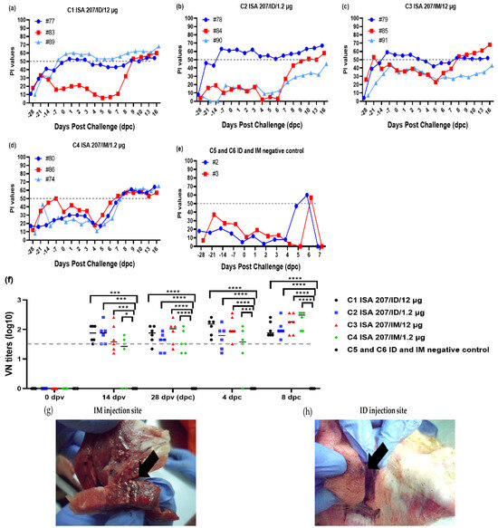 SP antibody (PI) and neutralizing antibody (VN titer) of SPF mini pigs in six challenge test groups vaccinated and bled at 0, 7, 14, 21, and 28 dpv and 0–16 dpc (Exp 2). (a–e) SP antibody responses in SPF mini pig sera collected at 0, 7, 14, 21, and 28 dpv and 0–16 days dpc. (f) VN titers (log10) of serotype A/Iraq/24/64 at 4 wpv. (g,h) Comparison of vaccine injection sites sacrificed at 16 dpc. The IM injection site exhibited nodular lesions in the neck muscle, whereas the ID injection site showed redness and small swelling on the skin. PI values ≥ 50% (dotted line) were considered positive for FMDV type A SP antibodies. VN titers ≥ 1.65 log10 (dotted line) were considered positive. C, challenge test group; ID, intradermal; IM, intramuscular; SPF, specific pathogen-free; SP, structure protein; PI, percentage inhibition; wpv, weeks post-vaccination; dpc, days post-challenge; the datasheets are the mean ± SEM; statistical analyses were performed using one-way ANOVA; * p < 0.05; *** p < 0.001; and **** p < 0.0001.