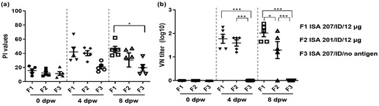 In Exp 3, all 15 pigs across three groups were bled at 0, 4, and 8 wpv and tested for SP antibodies and neutralizing antibodies (Figure 5). At 8 wpv, the average PI value of F1 (ISA 207/ID/12 μg, 45 PI value) was significantly higher than that of F2 (ISA 201/ID/12 μg, 31 PI value) and F3 (ISA 207/ID/no antigen, 19 PI value) (* p < 0.05) (Figure 5a). Similarly, the mean VN log10 values for sera collected at 8 wpv were 2.02 and 1.50 for F1 and F2, respectively, which were significantly higher than those of the control groups (*** p < 0.001). Furthermore, F1 showed slightly higher neutralizing antibody titers than F2 (* p < 0.05) (Figure 5b).