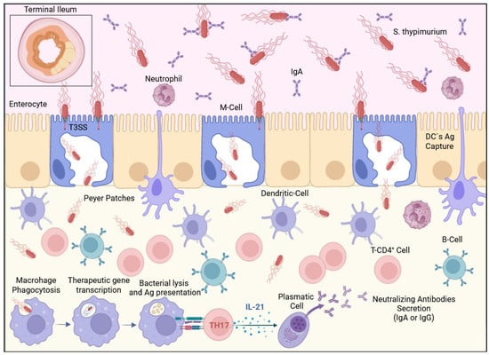 Since there are already highly effective approved vaccines based on live attenuated bacteria such as Ty21a (approved by the U.S. Food and Drug Administration (FDA) and the World Health Organization (WHO), manufactured by Berna Biotech, Bern, Swiss; PaxVax, San Diego, US; Sanofi Pasteur, Lyon, France; Biopharma, Lima, Perú), which can be used as a platform for future vaccines or cancer therapy [,,], there is the need to create recombinant models of Ty21a that can express the protease GtgE (from S. typhimurium). This protease can cleave GTPase Rab29, enabling the strain to survive inside phagosomes [] and give the bacteria enough time to deliver the encoded heterologous antigen, thus obtaining a more accurate approximation in a first animal model and setting a precedent for a possible clinical trial. Other interesting approaches in the near future might include combining encoded heterologous antigens in eukaryotic expression vectors with secreted fully ensembled antigens or even combining them with live or inactivated bacteria loaded with therapeutic drugs.