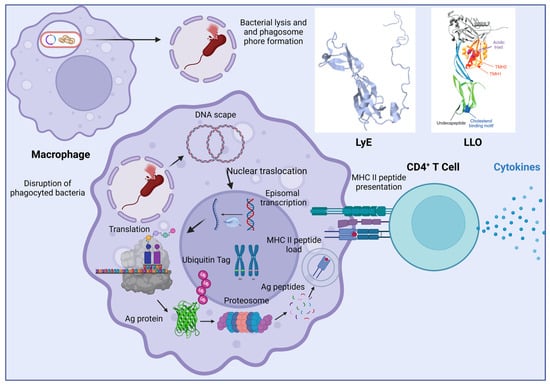 Bacterial and phagolysosome disruption, mRNA release, translation, antigen presentation, and T CD4+ activation mechanisms. In the transformed bacteria, the transcription of LyE and LLO lysins is activated under the phagolysosome’s acidic environment, releasing the cargo mRNA. This is followed by protein translation, proteasomal degradation, MHC II presentation, and subsequent CD4+ T cell activation. LyE transcription triggers bacterial lysis, while LLO transcription induces the formation of pores in the phagolysosome membrane, through which mRNA escapes.
