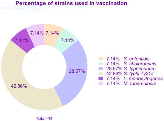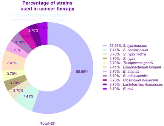 Other strains used as bacterial vectors for cancer therapy are Bifidobacterium longum, B. infantis, S. choleraesuis, and Toxoplasma gondii for melanoma and solid tumors [,,,], B. longum and B. adolescentis for liver cancer [,], Clostridium butyricum for glioma [], E. coli for colon cancer [], and Lactobacillus rhamnosus for bladder cancer [], among others. The list of the above-mentioned studies is displayed in Table 2 and the percentage of use of each type of strain is illustrated in Figure 4.