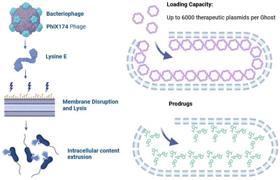 Preparation Method and Loading Strategies for Ghost Vaccine Candidates with Therapeutic DNA or Drugs. LyE protein from phage PhiX174 disrupts bacterial membrane leading to intracellular content extrusion. After several washes with PBS and centrifugation cycles, the ghosts are loaded with the desired therapeutic content. Up to ~6000 therapeutic plasmids per ghost or a not specified amount of chemotherapeutic drug or prodrug is loaded in the ghost bacteria. In both cases, the cargo is not covalently attached to the inner ghost membrane.