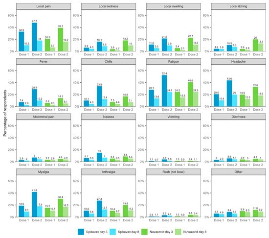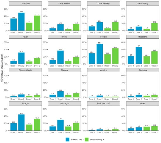 Medical review was reported by 3.1% of respondents, with the highest rate occurring after the second dose of each vaccine (Spikevax dose 2: 4.8%, Nuvaxovid dose 2: 3.9%). Additionally, 0.6% of all respondents reported visiting an emergency department (ED), which is higher than the rates observed in those who received Comirnaty and Vaxzevria vaccines in the initial six months of the COVID-19 vaccine rollout (0.9% medical review and 0.2% ED presentations) []. This cohort also reported a greater impact of vaccination on usual activities, with a higher proportion reporting missing two days (range: 29.5% to 34.5%) or three or more days (range: 14.3 to 24.4%) of usual activity compared to the cohort who were vaccinated with Comirnaty or Vaxzeveria (range for two days: 22.4% to 24.6%, range for three or more days: 5.4% to 6.6%). The disparities in medical review and impact on usual activity may stem from a different (and potentially more vaccine-hesitant) cohort more inclined to seek medical review for common expected AEFIs. Nuvaxovid was approved for use in January 2022 when 92.8% of the eligible population had already completed their COVID-19 priming doses [], and it is hypothesised that some people who were hesitant to receive an mRNA vaccine due to the reported association with myo-\peri\carditis may have delayed vaccination in order to receive Nuvaxovid []. Notably, the self-reported rate of chest pain/discomfort in our study was comparable between vaccines and ranged from 0.6% to 1.3%. Other considerations are the changes in the pandemic situation and control measures [] since the Deng et al. study. However, it is important to note that reported adverse events in this study have not been further clinically investigated, and causality from vaccination cannot be inferred due to the temporal relationship alone; some AEFI may be linked to other causes, such as intercurrent infection with circulating viruses (resulting in medical review or time off normal duties) rather than being associated with the vaccine. Nevertheless, reported AEFI appear transient, with specific AEFI rates lower in the day 8 survey compared to the day 3 survey.