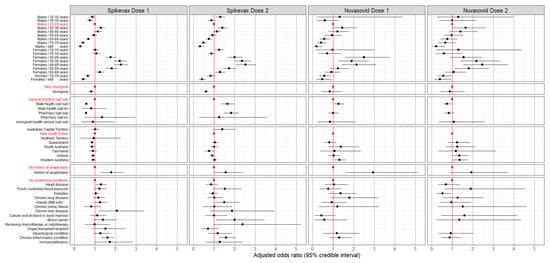 Aboriginal respondents were less likely to report AEFI following Spikevax (dose 1: adjusted odds ratio (aOR), 0.79; 95% credible interval (CrI), 0.67–0.92; dose 2: aOR, 0.59, 95% CrI, 0.49–0.70) compared to non-Aboriginal respondents. Respondents with a history of anaphylaxis were more likely to report any AEFI than those who did not report a history of anaphylaxis, with the effect greater for Nuvavoxid (dose 1: aOR, 2.86; 95% CrI, 1.56–4.85; dose 2: aOR, 1.72; 95% CrI, 0.81–3.26) compared to Spikevax (dose 1: aOR, 1.76; 95% CrI, 1.27–2.37; dose 2: aOR, 1.50; 95% CrI, 0.97–2.26) (Figure 3). Just over half (59%) of the respondents with a history of anaphylaxis reported any AEFI, with 18.7% of these respondents seeking medical attention from a GP or Aboriginal healthcare worker and 3.6% of these respondents stating they attended ED for the AEFI.