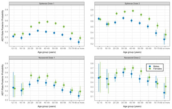 The proportion of participants who reported AEFI in the day 3 survey for each vaccine brand and dose number was modelled using Bayesian logistic regression, similar to the analysis described in Deng et al. []. An interaction term was modelled for age and sex to account for sex-specific age effects, as suggested by evidence presented in Table S3, Supplementary Materials. The model also adjusted for Indigenous status, clinic type, jurisdiction, anaphylaxis history, and underlying medical condition. Survey responses reporting sex as other (n = 47), missing age (n = 40), or missing Indigenous status (n = 1136) were excluded from analysis (2.3%). To address the 9204 day 3 survey responses (18.1%) with missing sex data, the majority of which were self-reports collected from pharmacy sites, the model was marginalised over sex for these respondees (i.e., assumed that sex was missing at random) [,]. Posterior distributions for model parameters were estimated using STAN [] via the cmdstanr R package (version 0.6.1) []. Each model was run with 8 chains of 1000 iterations, and model convergence was assessed using cmdstanr diagnostic tools (see Supplementary Materials for further information).