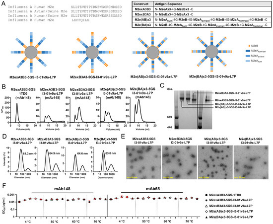 Design and in vitro characterization of influenza A-B M2e-based immunogens. (A) Top left: Amino acid sequences for influenza A M2e from human (UniProt: P06821, residue 2–24), avian/swine (residue 2–24) [16], and human/swine (residue 2–24) [16] and influenza B M2e from human (UniProt: A4D452, residue 2–9). Top right: Series of designed antigen sequences for influenza A-B M2exA3B3, M2exB3A3, M2e(AB)x3, and M2e(BA)x3 constructs. A glycine (G4) linker was added between any two adjacent M2e peptides, regardless of IAV and IBV M2e. Bottom: Schematics of influenza A-B M2e antigens consisting of various arrangements of human, avian, and swine IAV M2e plus three copies of IBV M2e displaying on I3-01v9a-LD7-PADRE (or simply I3-01v9a-L7P) SApNPs. (B) SEC profiles of the M2exA3B3-5GS-1TD0 trimer and M2exA3B3-, M2exB3A3-, M2e(AB)x3-, and M2e(BA)x3-presenting I3-01v9a SApNPs. The trimer was analyzed on a Superdex 75 Increase 10/300 GL column and four SApNPs were analyzed using a Superose 6 Increase 10/300 GL column. (C) BN-PAGE for mAb148-purified influenza A-B M2e I3-01v9a SApNPs. (D) DLS profiles of mAb148-purified influenza A-B M2e I3-01v9a SApNPs. Average particle sizes derived from DLS are labeled. (E) nsEM micrographs of mAb148-purified influenza A-B M2e I3-01v9a-L7P SApNPs. (F) ELISA analysis of the M2eA3B3-5GS-1TD0 trimer and M2exA3B3-, M2exB3A3-, M2e(AB)x3-, and M2e(BA)x3-presenting I3-01v9a SApNPs binding to mAb148 (left) and mAb65 (right) before and after heating to 50 °C, 60 °C, and 70 °C for 30 min.