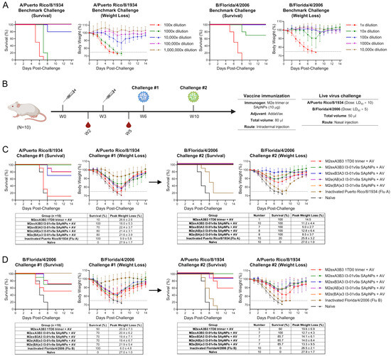 The protective efficacy of influenza A-B M2e trimer and SApNPs was evaluated in BALB/c mice. We grew and propagated the mouse-adapted A/Puerto Rico/8/1934 (H1N1) and B/Florida/4/2006 (Yamagata) in MDCK cells as previously described [27]. Next, we evaluated the lethality of these viruses in mice to determine survival rates in benchmark challenge studies (Figure 2A). We then used the Reed–Muench and Spearman–Karber methods [51,52] to calculate the viral dilutions to produce an LD50 in mice. We determined the LD50 to be 4217× and 5.2× dilutions for A/Puerto Rico/8/1934 (H1N1) and B/Florida/4/2006, respectively. Based on these LD50 values, we determined the appropriate LD50 × 10 and LD50 × 5 challenge doses for evaluating the protective efficacy of the influenza A-B M2e immunogens.