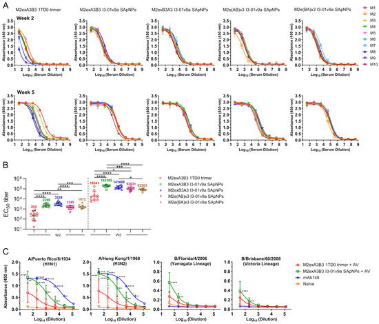 We assessed the M2e binding antibody response in mouse serum using the sequence-matched M2e trimer and determined EC50 titers by ELISA (Figure 3A,B and Supplementary Figure S2). For example, the M2exA3B3-5GS-foldon trimer was used as a coating antigen for the M2exA3B3-5GS-1TD0 trimer and M2exA3B3 I3-01v9a SApNP groups, and the M2e(AB)x3-5GS-foldon trimer was used to analyze the M2e(AB)x3 I3-01v9a SApNP group. M2exA3B3 presented on the I3-01v9a SApNP elicited superior binding antibody responses in immunized mice at both weeks 2 and 5, showing 11.3- and 10.1-fold higher EC50 titers, respectively, compared to the corresponding 1TD0 trimer (p < 0.0001). Although the coating antigens were different, the EC50 titers of the four I3-01v9a SApNP groups against the sequence-matched M2e trimer probes showed significantly higher values than the M2exA3B3 1TD0 trimer group at all time points. Among the four SApNPs, the M2exA3B3 I3-01v9a SApNP yielded the highest EC50 titer at week 5.