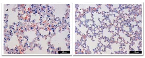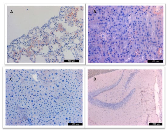 The Avidin Biotin Complex Peroxidase method was used by modifying the kit procedure. The tissue samples (lung, liver, kidney, and brain) were fixed in 10% neutral buffered formalin and processed and paraffin-blocked for histology using standard methods. Afterwards, we carried out deparaffinization and rehydration of tissue sections taken from paraffin blocks prepared for histopathological examinations to adhesive (APES) slides in a 3% hydrogen peroxide–methanol mixture (20 min) to prevent endogenous peroxidase activity at room temperature; we did so using trypsin (12 min) and EDTA buffer (25 min at 100 °C). They were incubated in protein-blocking serum for 10 min at 37 °C. Then, the primary antibody (1:1000 dilution) was applied (1 h) in the humidity chamber. The incubation was carried out with a biotininized antibody and streptavidin peroxidase for 15 min at 37 °C. Afterwards, the sections were incubated in 3-amino-9-ethylcarbazole (AEC) solution and Mayer’s hematoxylin (3–5 min), washed in running tap water, and covered with gel. The sections were washed with PBS between all steps indicated, with the exception of the protein-blocking step.