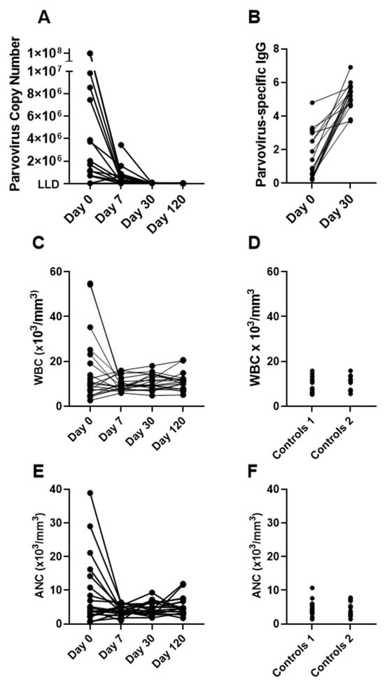 As previously described, the virus was quickly controlled after hospitalizations as the virus-specific IgG response was mounted (Figure 1A,B). CBC measurements revealed unusually high WBC and ANC among several patients on Day 0, the day of hospitalization. WBC scored higher than 50 × 103/mm3 and ANC scored higher than 30 × 103/mm3 in one patient, unlike the controls (Figure 1C–F). The controls included patients with SCD who were exposed to parvovirus B19 in the past (Controls 1) or who had no known previous exposure (Controls 2).