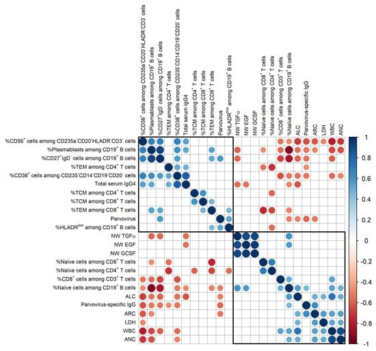 Cluster 1 included WBC, ANC, and parvovirus-specific IgG. The negative correlation between parvovirus-specific IgG and virus signified a functional, protective adaptive immune response.