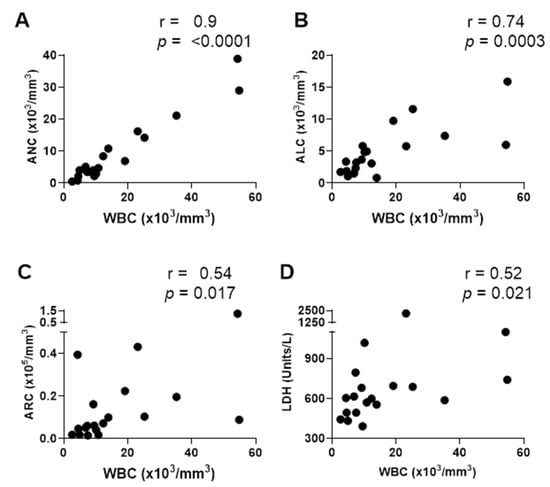 As shown, WBC correlated positively with ANC (r = 0.90, p = <0.0001), ALC (r = 0.74, p = 0.0003), ARC (r = 0.54, p = 0.017), and LDH (r = 0.52, p = 0.021). WBC also correlated positively with % naïve cells among CD19+ B cells (r = 0.54, p = 0.018), and % CD8+ cells among CD3+ T cells (r = 0.54, p = 0.017).