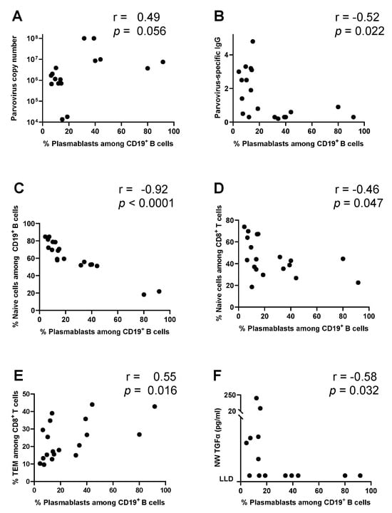 % plasmablasts among CD19+ B cells correlate negatively with parvovirus-specific IgG. Associations between % plasmablasts among CD19+ B cells and parvovirus copy number (A), parvovirus-specific IgG (B), % naïve cells among CD19+ B cells (C), % naïve cells among CD8+ T cells (D), % TEM among CD8+ T cells (E), and NW TGFα (F) are shown.
