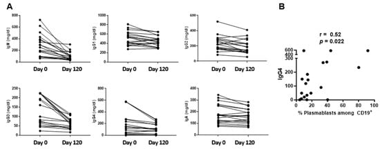 Serum immunoglobulin isotypes. Serum immunoglobulin isotype values are shown for Days 0 and 120 (A). A positive correlation was observed between IgG4 (mg/dL) and % plasmablasts among CD19+ B cells (B).