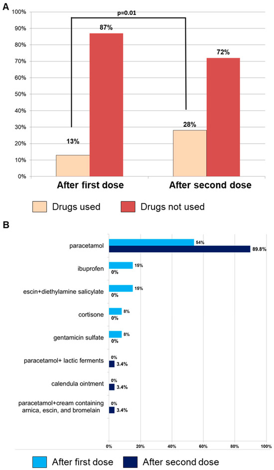 Among 271 subjects who received the first dose, 254 of them (93.7%) completed the vaccination cycle, reporting AEFIs in 41% of cases (n = 105). No significant differences were observed between AEFI occurrence after the first and second dose (41% vs. 37%; p = 0.34), and pain at the injection site was the most common symptom (n = 65; 62%), followed by fever (n = 41; 39%), fatigue–exhaustion (n = 20; 19%), and local skin reactions (n = 13; 12%) (Table 2). Medications were more frequently used for AEFI treatment after the second dose (n = 29, 28% vs. n = 13, 13%, second vs. first dose; p = 0.01), and paracetamol, alone or in combination with probiotics, was the most used drug (Figure 1). Although the use of medications was associated with better management of AEFIs, leading to a significantly shorter duration of symptoms, expressed in hours (h), after the second dose compared to the first dose (mean duration ± SD, 53 ± 76 h vs. 90 ± 157 h, respectively; p = 0.03) (Table 2), the data do not conclusively indicate that the increased medication use directly caused this reduction in duration. Other factors may also contribute to this outcome, such as individual variability in immune response, the booster effect after the first dose, patient experience in managing symptoms, and psychological factors. Similarly, local reactions after the first dose lasted longer compared to systemic manifestations (mean duration ± SD, 110 ± 176 h vs. 51 ± 57 h, respectively; p = 0.03) (Table 2).