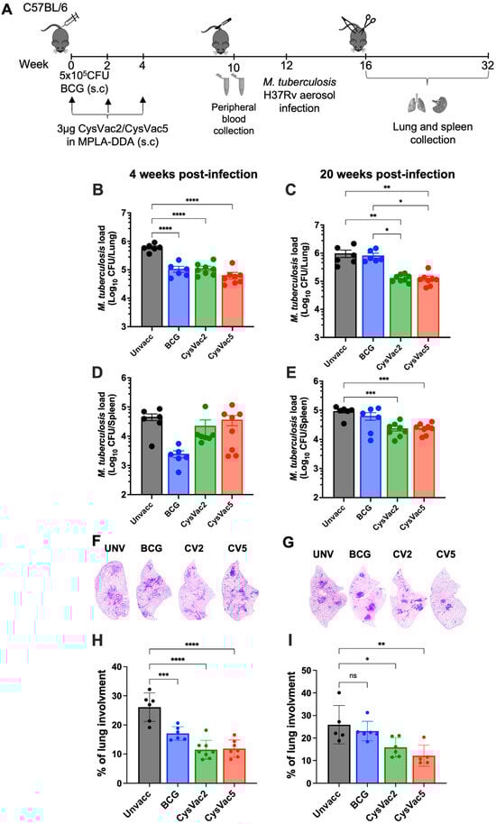 3.2. CysVac5-MPLA/DDA Reduced the Bacterial Burden and Pathology in M. tuberculosis-Infected Mice