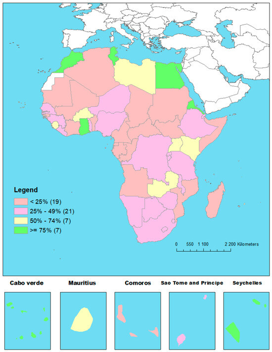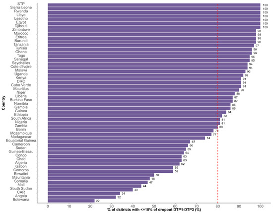 Distribution of the percentage of districts with less than 10% dropout rate between DTP1 and DTP3 in 2023 in African countries. DRC: Democratic Republic of Congo; STP: Sao Tome and Principe; CA: Central African Republic.