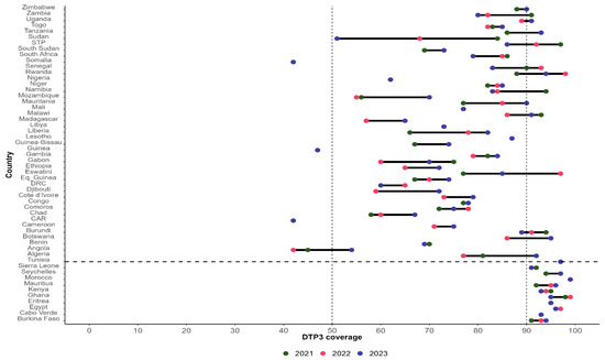Figure 2 presents the distribution of DTP3 coverage in 2021, 2022, and 2023 by country in Africa.
