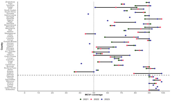 Large inequalities in the subnational dropout rate tend to be correlated with low DTP1 and DTP3 coverage at the national level [19]. The second and third indicators of the fourth commitment are related to the proportion of countries with sustained DPT3 and MCV1 coverages of 90% or above in the past three years. In 2023, these indicators were achieved by 11 countries (20%) for DTP3 coverage and 10 countries (18%) for MCV1. This means that most countries in Africa did not sustain DTP1 and MCV1 coverages as of the end of 2023. Several authors have reported a drop in DTP3 and MCV1 coverage during the COVID-19 pandemic period [20,21,22]. LaFond et al. [22] identified four direct drivers of routine immunization coverage improvement, including (i) engaging more with community-centered health workers, (ii) strengthening the collaboration between health districts, local governments, and community groups to plan and execute immunization services, raise awareness, and define strategies to reach underserved areas, (iii) carrying out regular immunization data reviews to inform operational decisions, and (iv) tailoring immunization services to community needs and conditions. Addressing these drivers implies implementing the “reaching every district” strategy [23], developed and introduced in 2002 by the WHO, the United Nations Children’s Fund (UNICEF), and other partners to improve immunization systems in areas with low coverage [24].