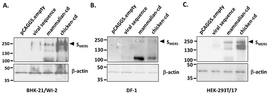Codon optimization strongly enhanced SMERS expression. pCAGGS.empty, or pCAGGS plasmids carrying either the native viral sequence (viral sequence), mammalian-codon optimized sequence (mammalian-cd), or chicken-codon optimized sequence (chicken-cd) were transfected, 1 µg each, into (A) BHK-21/WI-2, (B) DF-1 cells, or (C) HEK-293T/17 cells. At 72 h post transfection, cell lysates were collected and SMERS expression was measured by Western blot using rabbit anti-S2 antibody as the primary antibody.